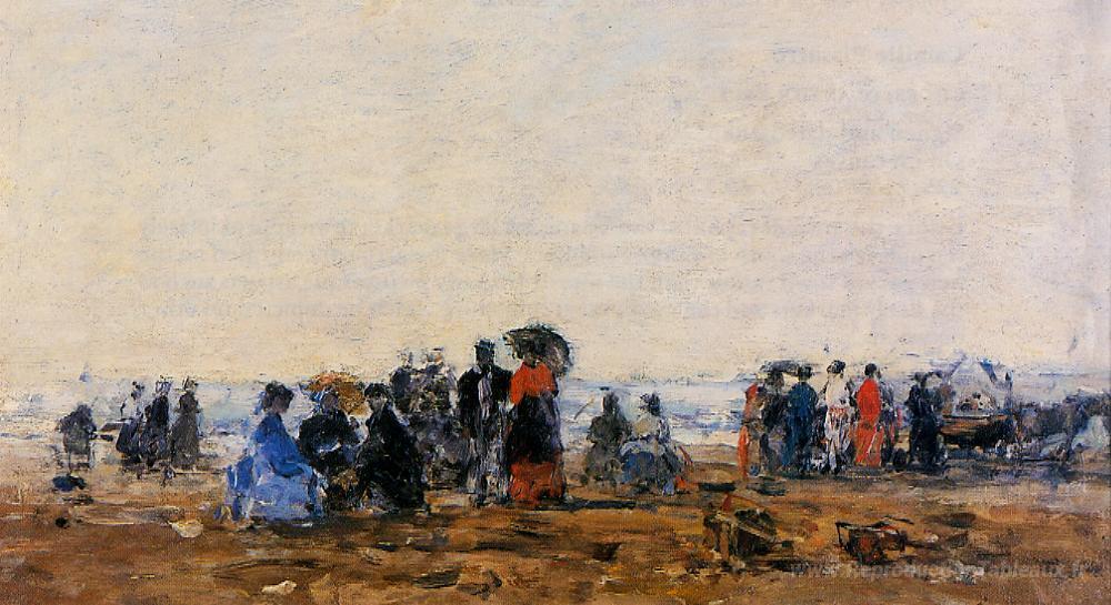 Nous vous proposons une reproduction artisanale sur toile du célèbre tableau 'Scène de plage' de Eugene Boudin, provenant du Musée de la Reproduction.