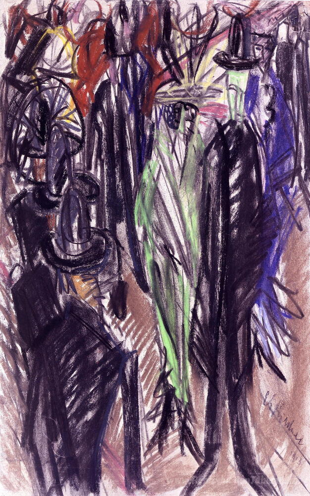 Nous vous proposons une reproduction artisanale sur toile du célèbre tableau 'Scène de rue' de Ernst Ludwig Kirchner, provenant du Musée de la Reproduction.