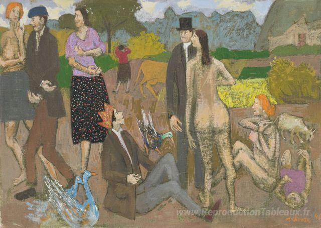 Nous vous proposons une reproduction artisanale sur toile du célèbre tableau 'Scène de village aux oiseaux bleus' de Grégoire Michonze, provenant du Musée de la Reproduction.