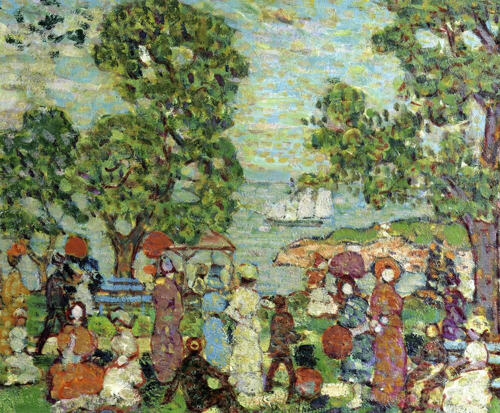 Nous vous proposons une reproduction artisanale sur toile du célèbre tableau 'Scène du parc Nebay' de Maurice Prendergast, provenant du Musée de la Reproduction.