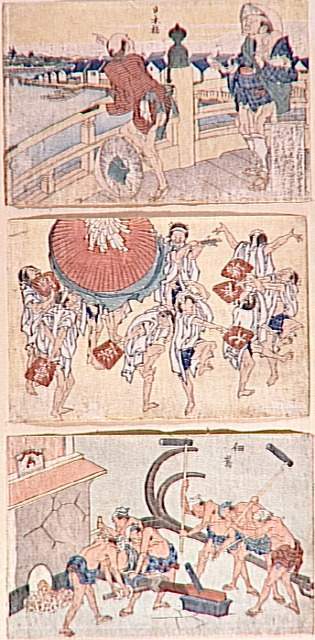 Nous vous proposons une reproduction artisanale sur toile du célèbre tableau 'Scènes de rue nouvellement puni' de Katsushika Hokusai, provenant du Musée de la Reproduction.