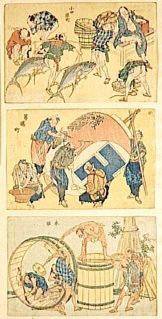 Nous vous proposons une reproduction artisanale sur toile du célèbre tableau 'Scènes de rue nouvellement puni' de Katsushika Hokusai, provenant du Musée de la Reproduction.