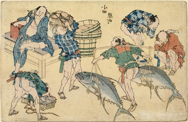 Nous vous proposons une reproduction artisanale sur toile du célèbre tableau 'Scènes de rue nouvellement puni' de Katsushika Hokusai, provenant du Musée de la Reproduction.
