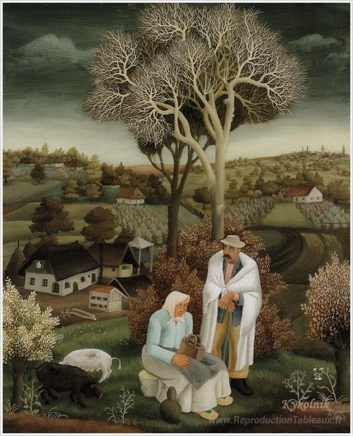 Nous vous proposons une reproduction artisanale sur toile du célèbre tableau 'Se reposer sous l'arbre' de Ivan Generalic, provenant du Musée de la Reproduction.