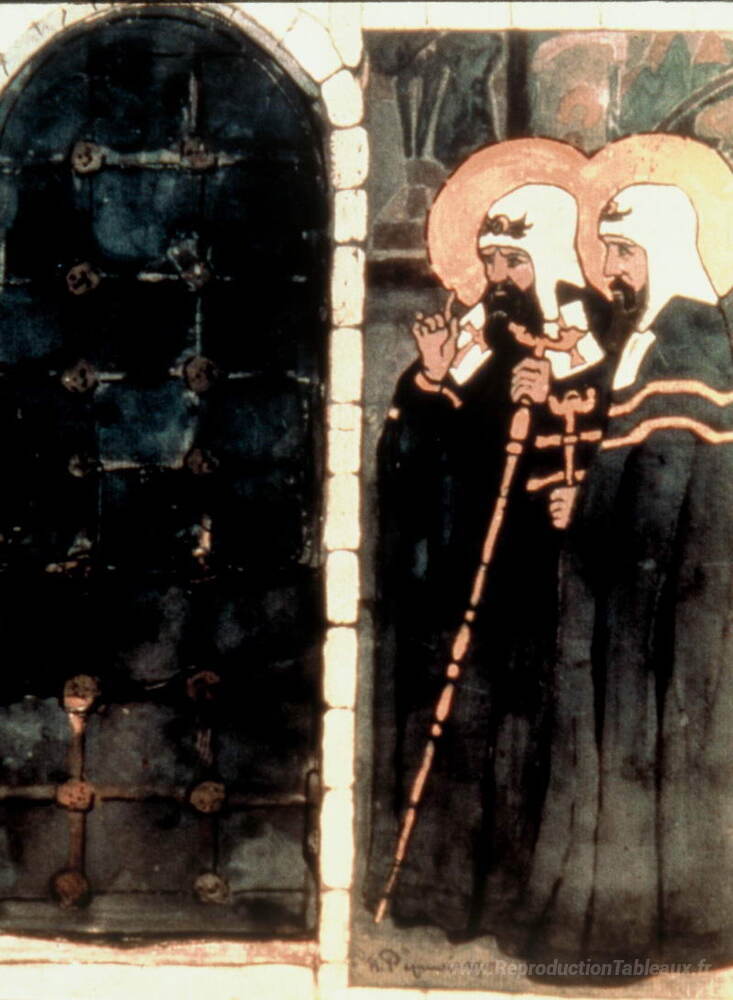 Nous vous proposons une reproduction artisanale sur toile du célèbre tableau 'Seigneurs étrangers' de Nicholas Roerich, provenant du Musée de la Reproduction.