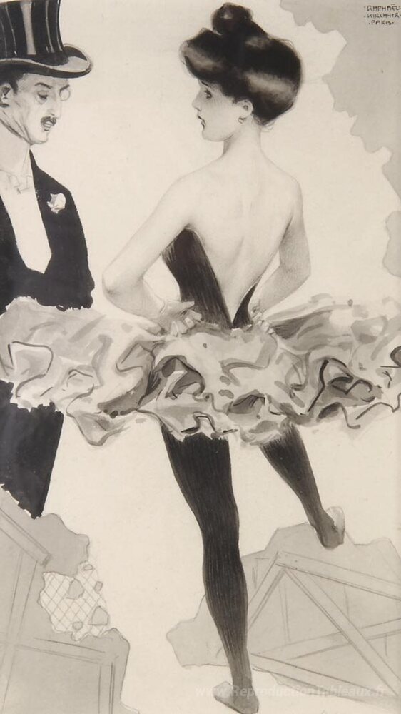 Nous vous proposons une reproduction artisanale sur toile du célèbre tableau 'S'entraîne Urteil' de Raphael Kirchner, provenant du Musée de la Reproduction.