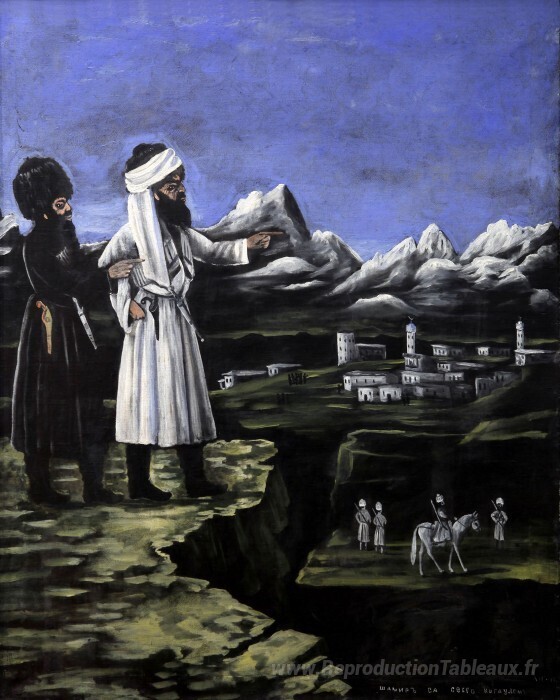 Nous vous proposons une reproduction artisanale sur toile du célèbre tableau 'Shamili avec un garde du corps' de Niko Pirosmani, provenant du Musée de la Reproduction.