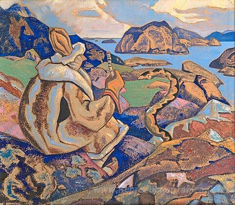 Nous vous proposons une reproduction artisanale sur toile du célèbre tableau 'Snakes face (chuchotant un serpent)' de Nicholas Roerich, provenant du Musée de la Reproduction.