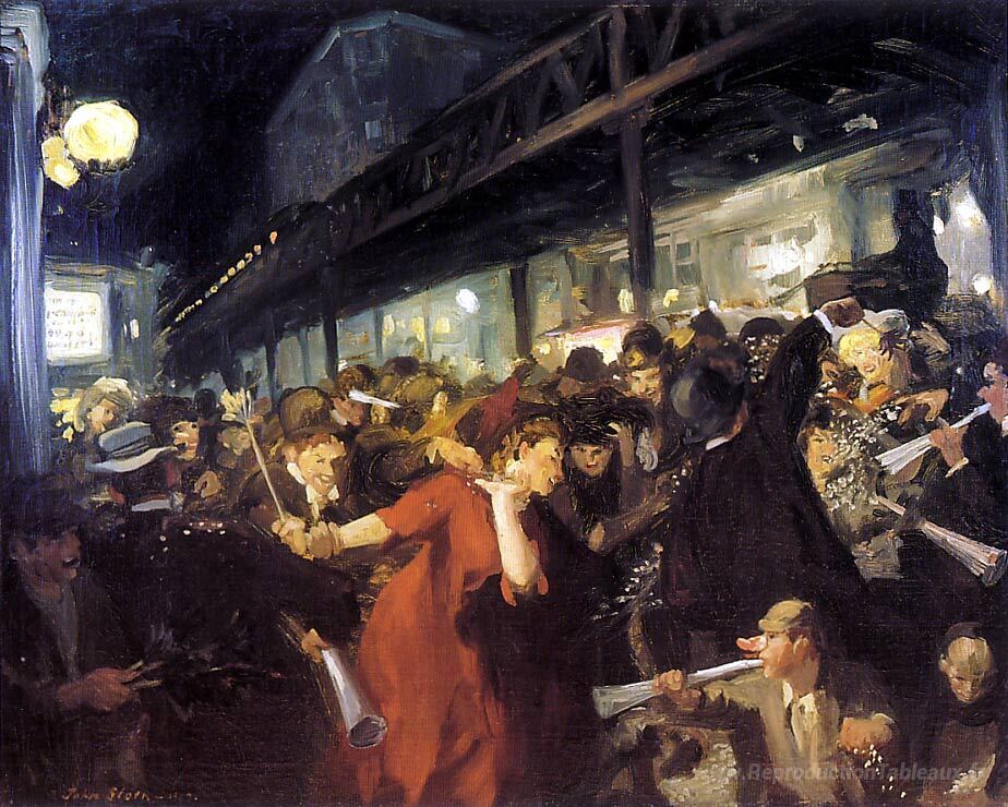 Nous vous proposons une reproduction artisanale sur toile du célèbre tableau 'Soirée électorale' de John French Sloan, provenant du Musée de la Reproduction.