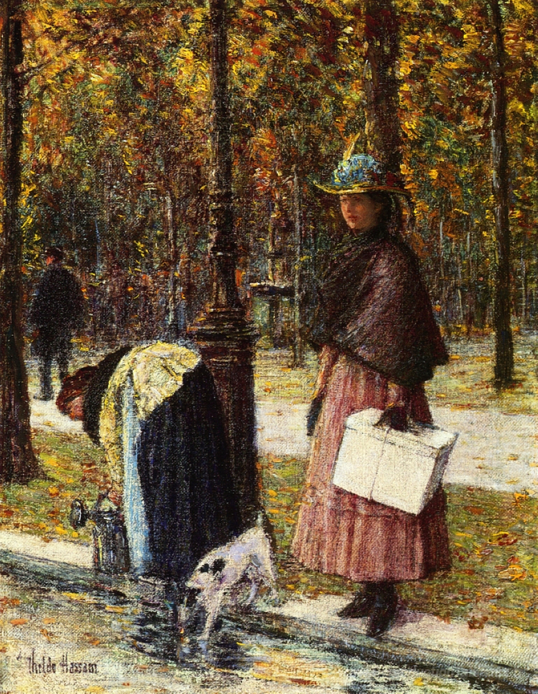 Nous vous proposons une reproduction artisanale sur toile du célèbre tableau 'Soirée, Champs-Elysees (alias Pres du Louvre)' de Childe Hassam, provenant du Musée de la Reproduction.
