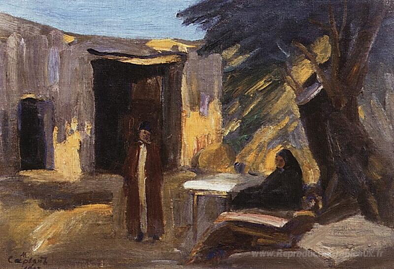 Nous vous proposons une reproduction artisanale sur toile du célèbre tableau 'Soirée dans le jardin' de Martiros Saryan, provenant du Musée de la Reproduction.