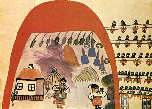 Nous vous proposons une reproduction artisanale sur toile du célèbre tableau 'Spectacle "Cosaque au-delà du Danube"' de Maria Primachenko, provenant du Musée de la Reproduction.