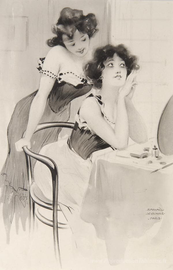 Nous vous proposons une reproduction artisanale sur toile du célèbre tableau 'Sur la coiffeuse' de Raphael Kirchner, provenant du Musée de la Reproduction.