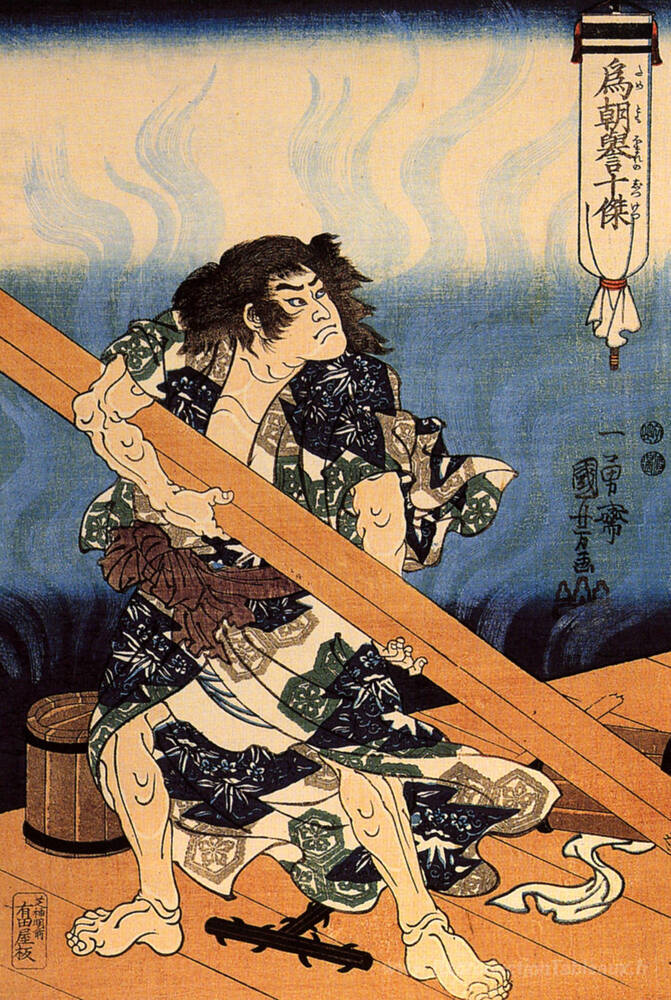 Nous vous proposons une reproduction artisanale sur toile du célèbre tableau 'Tametomo soulevant une poutre lourde' de Utagawa Kuniyoshi, provenant du Musée de la Reproduction.