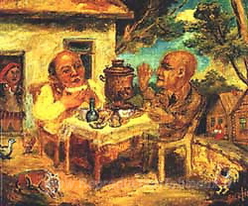 Nous vous proposons une reproduction artisanale sur toile du célèbre tableau 'TEATHE (autoportrait avec Raphael Sawyer)' de David Burliuk, provenant du Musée de la Reproduction.