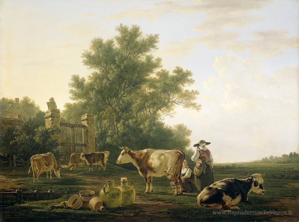 Nous vous proposons une reproduction artisanale sur toile du célèbre tableau 'Temps de traite' de Abraham van Strij, provenant du Musée de la Reproduction.