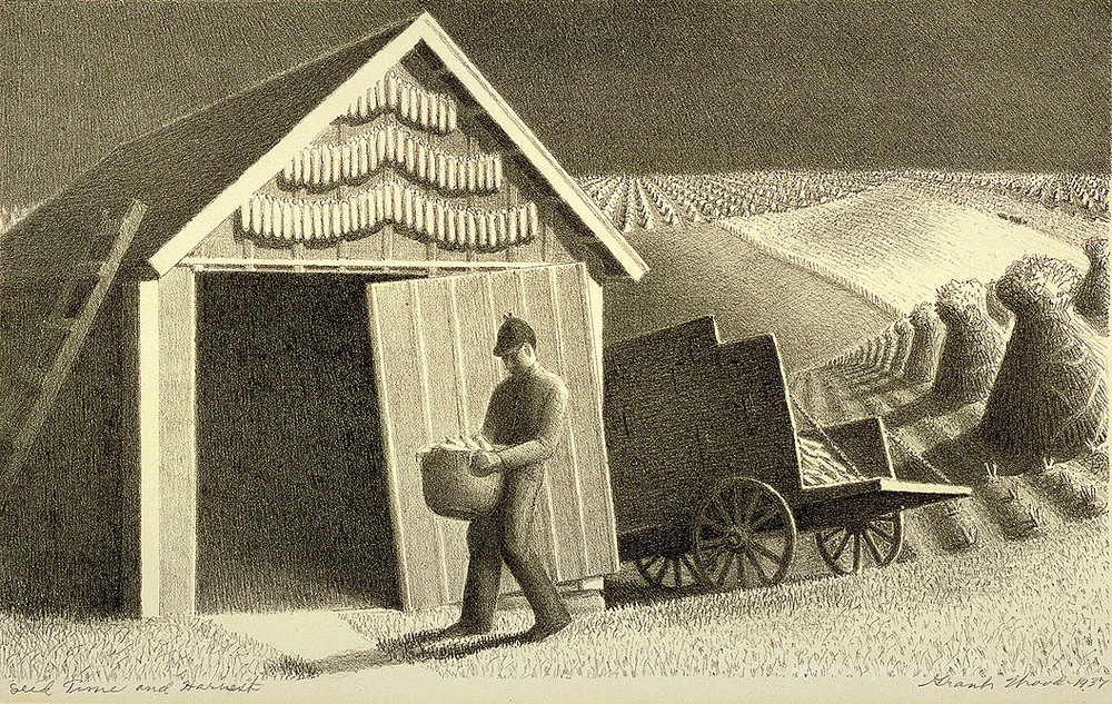 Nous vous proposons une reproduction artisanale sur toile du célèbre tableau 'Temps des semences et récolte' de Grant Wood, provenant du Musée de la Reproduction.