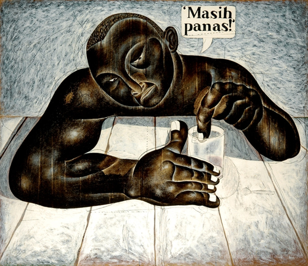 Nous vous proposons une reproduction artisanale sur toile du célèbre tableau 'Toujours chaud' de Nyoman Masriadi, provenant du Musée de la Reproduction.
