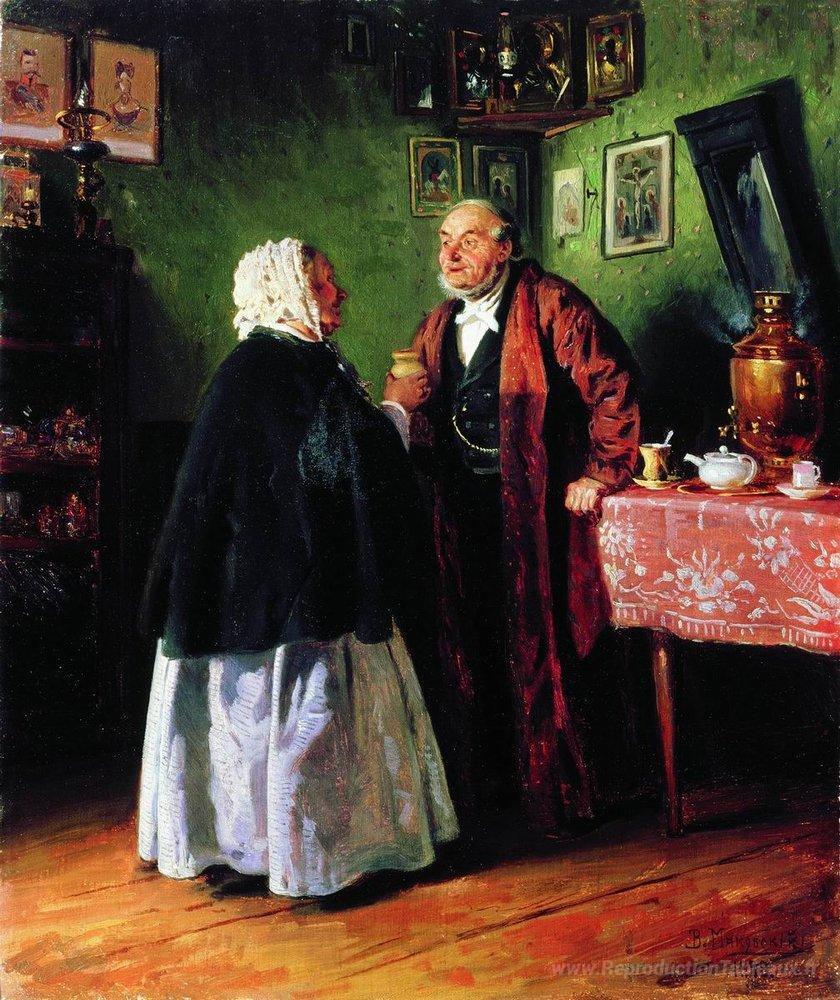 Nous vous proposons une reproduction artisanale sur toile du célèbre tableau 'Toutes nos félicitations' de Vladimir Makovsky, provenant du Musée de la Reproduction.