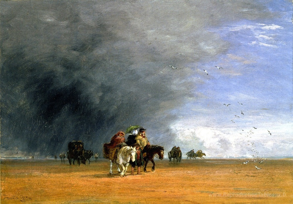 Nous vous proposons une reproduction artisanale sur toile du célèbre tableau 'Traverser les sables' de David Cox, provenant du Musée de la Reproduction.