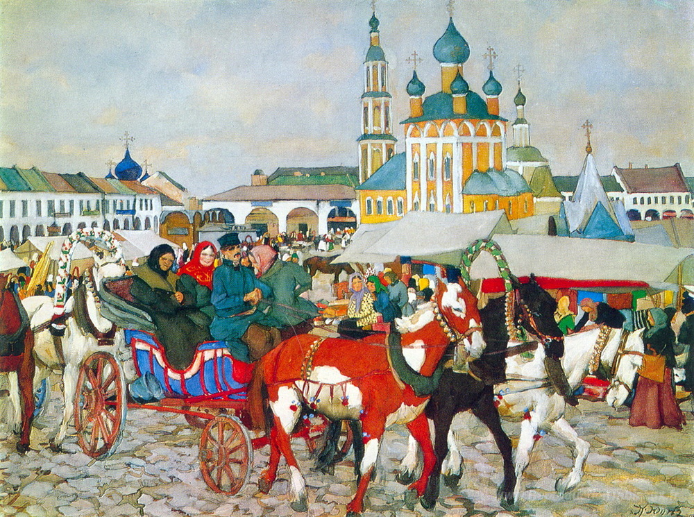Nous vous proposons une reproduction artisanale sur toile du célèbre tableau 'Triple en uglich' de Konstantin Yuon, provenant du Musée de la Reproduction.