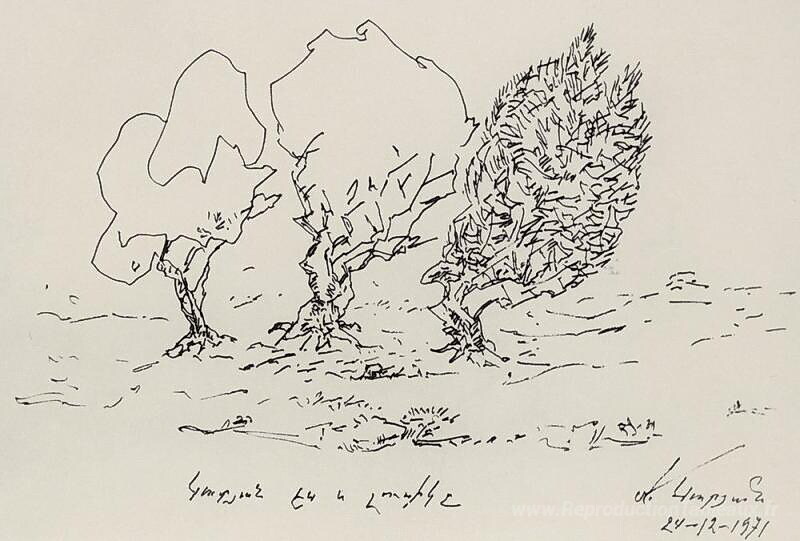 Nous vous proposons une reproduction artisanale sur toile du célèbre tableau 'Trois arbres (Kate, Lusik et moi)' de Martiros Saryan, provenant du Musée de la Reproduction.
