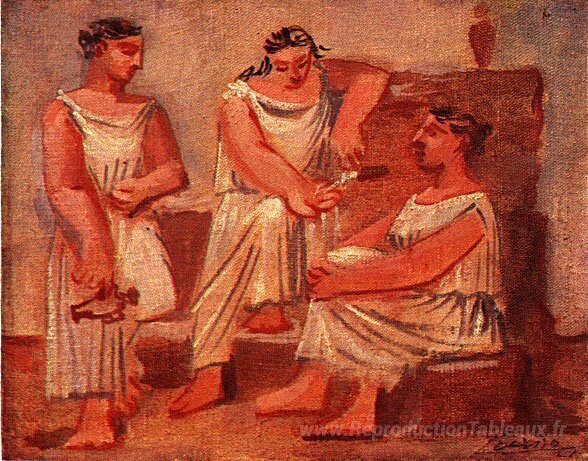 Nous vous proposons une reproduction artisanale sur toile du célèbre tableau 'Trois femmes dans une fontaine' de Pablo Picasso, provenant du Musée de la Reproduction.