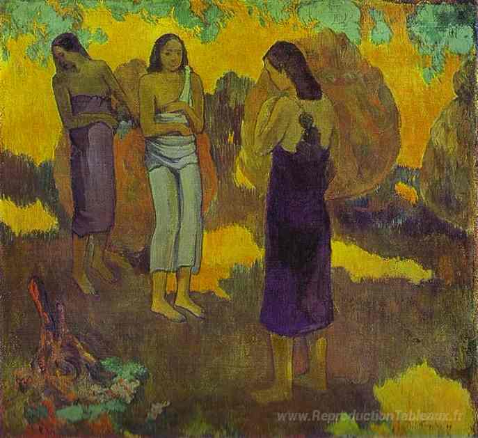 Nous vous proposons une reproduction artisanale sur toile du célèbre tableau 'Trois femmes tahitiennes sur fond jaune, 1899 (huile sur toile)' de Paul Gauguin, provenant du Musée de la Reproduction.