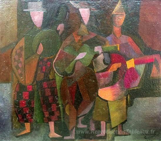 Nous vous proposons une reproduction artisanale sur toile du célèbre tableau 'Trois musiciens' de M. H. Maxy, provenant du Musée de la Reproduction.