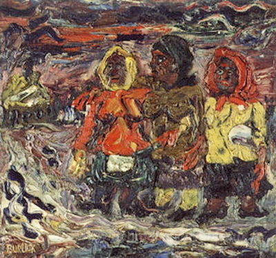 Nous vous proposons une reproduction artisanale sur toile du célèbre tableau 'Trois paysans' de David Burliuk, provenant du Musée de la Reproduction.