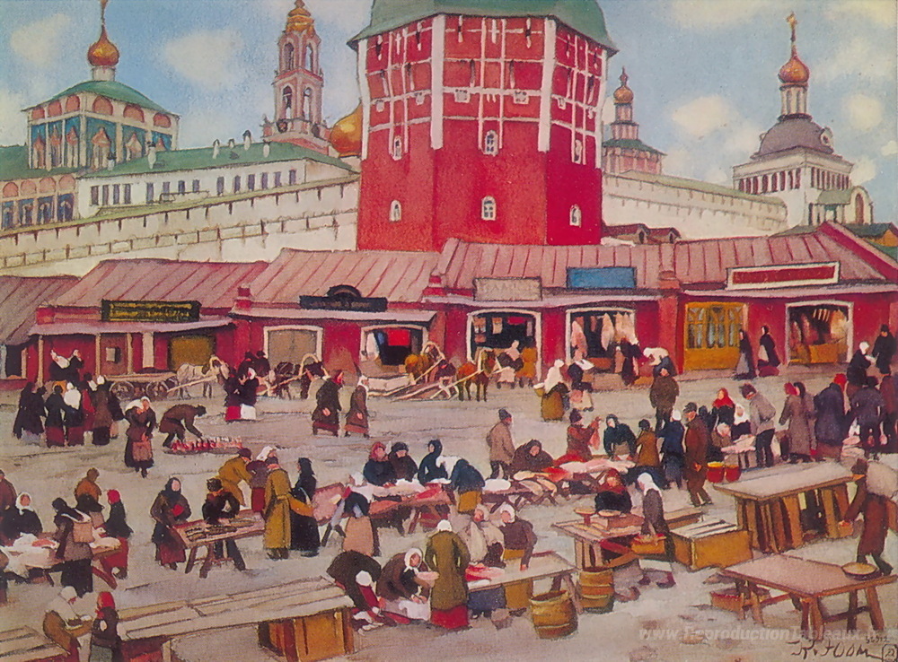 Nous vous proposons une reproduction artisanale sur toile du célèbre tableau 'Troitsky Simples. Zagorsk' de Konstantin Yuon, provenant du Musée de la Reproduction.