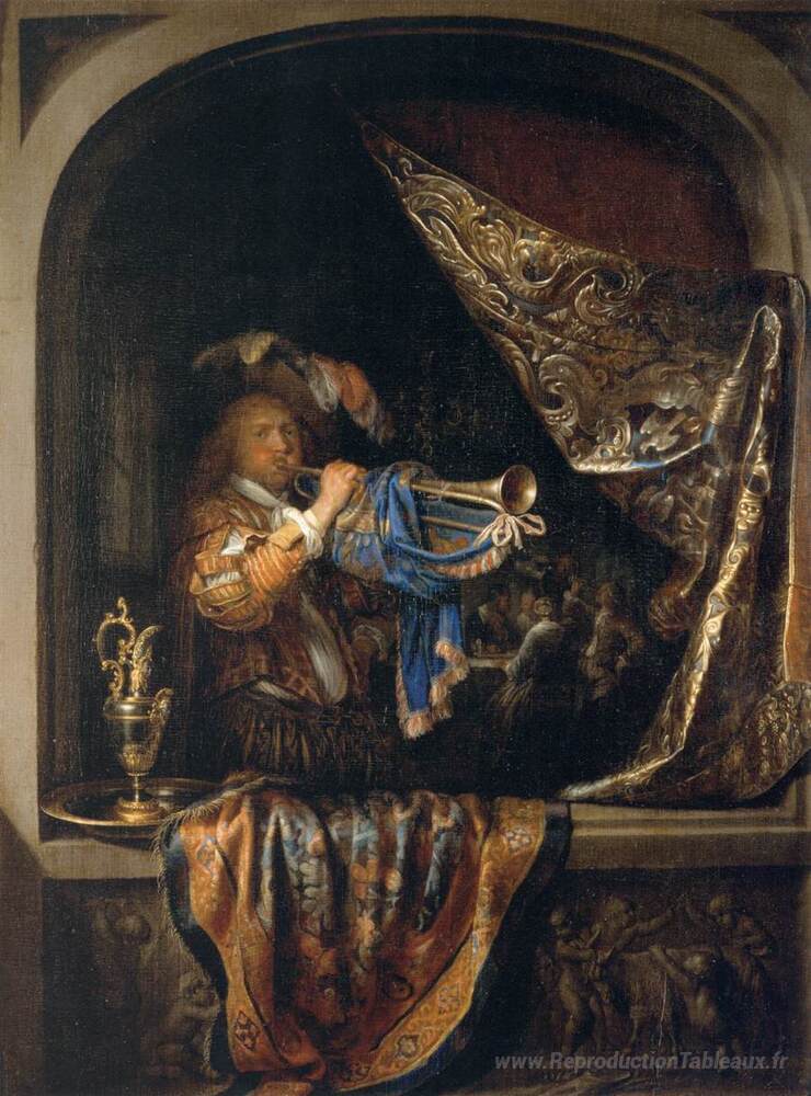Nous vous proposons une reproduction artisanale sur toile du célèbre tableau 'Trompettiste devant un banquet' de Gerrit Dou, provenant du Musée de la Reproduction.