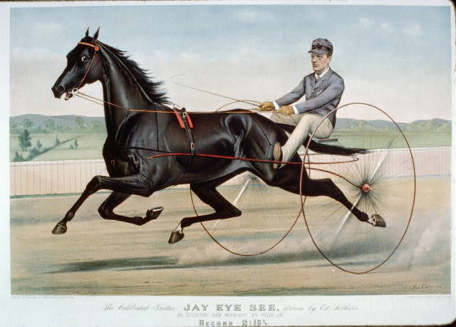 Nous vous proposons une reproduction artisanale sur toile du célèbre tableau 'Trotter célèbre Jay Eye See' de Currier and Ives, provenant du Musée de la Reproduction.