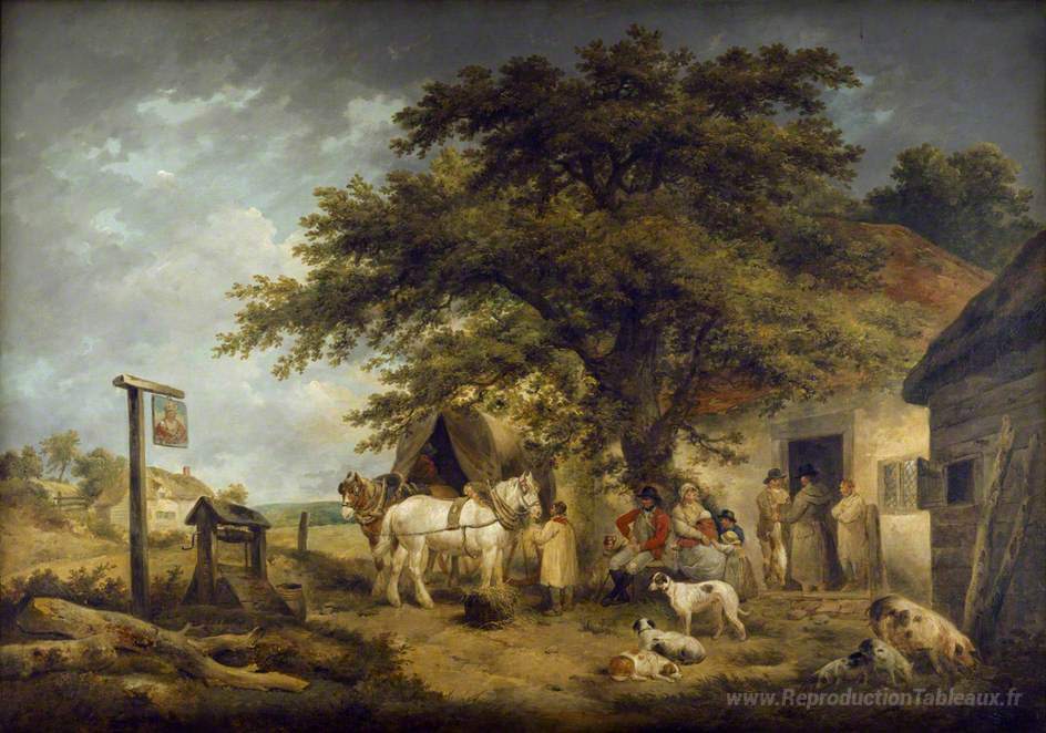 Nous vous proposons une reproduction artisanale sur toile du célèbre tableau 'Un arrêt d'un soldat et de sa famille' de George Morland, provenant du Musée de la Reproduction.
