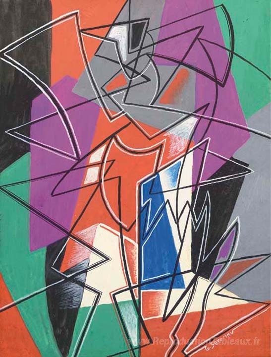 Nous vous proposons une reproduction artisanale sur toile du célèbre tableau 'Un danseur' de Gino Severini, provenant du Musée de la Reproduction.
