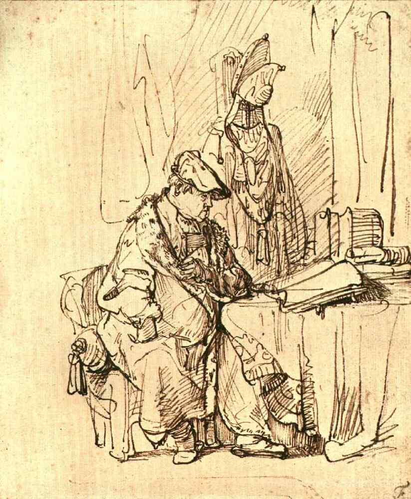 Nous vous proposons une reproduction artisanale sur toile du célèbre tableau 'Un homme assis à une table recouverte de livres' de Rembrandt, provenant du Musée de la Reproduction.