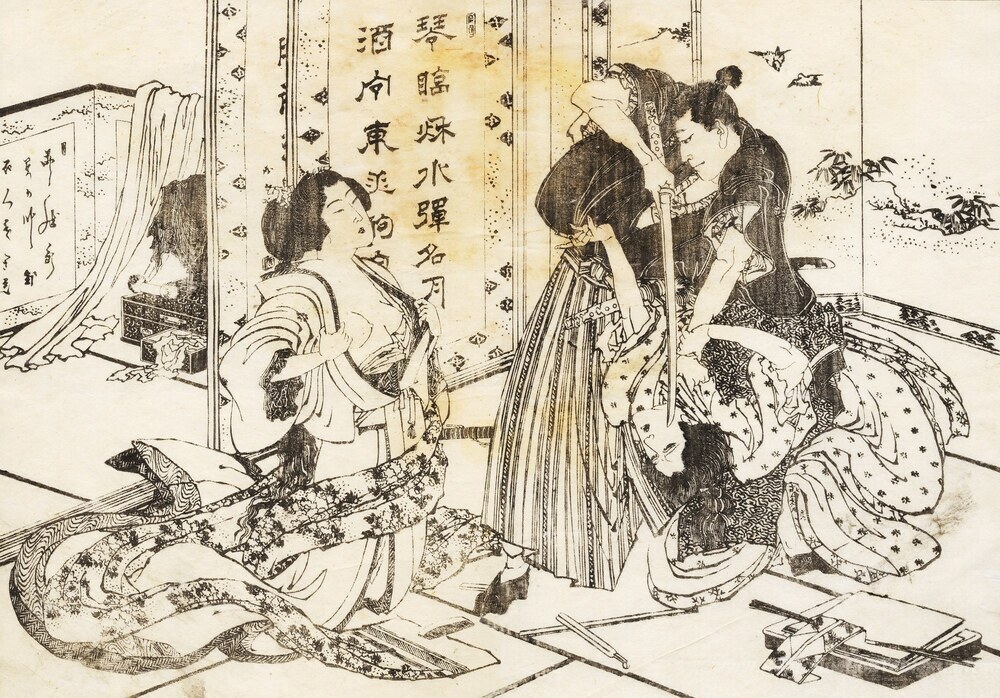 Nous vous proposons une reproduction artisanale sur toile du célèbre tableau 'Un homme méchant tuera une femme avec son épée' de Katsushika Hokusai, provenant du Musée de la Reproduction.