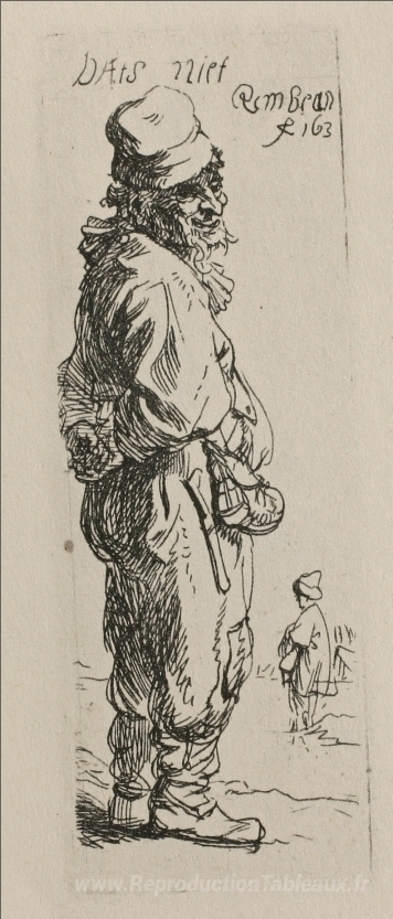 Nous vous proposons une reproduction artisanale sur toile du célèbre tableau 'Un mendiant et une pièce complémentaire, tournée vers la droite' de Rembrandt, provenant du Musée de la Reproduction.