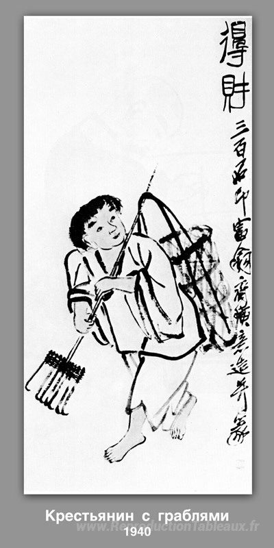 Nous vous proposons une reproduction artisanale sur toile du célèbre tableau 'Un paysan avec un râteau' de Qi Baishi, provenant du Musée de la Reproduction.
