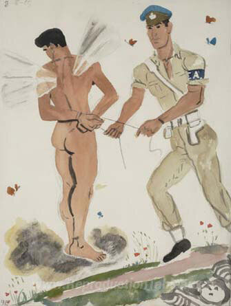 Nous vous proposons une reproduction artisanale sur toile du célèbre tableau 'Un policier militaire arrêtant l'esprit' de Yiannis Tsaroychis, provenant du Musée de la Reproduction.