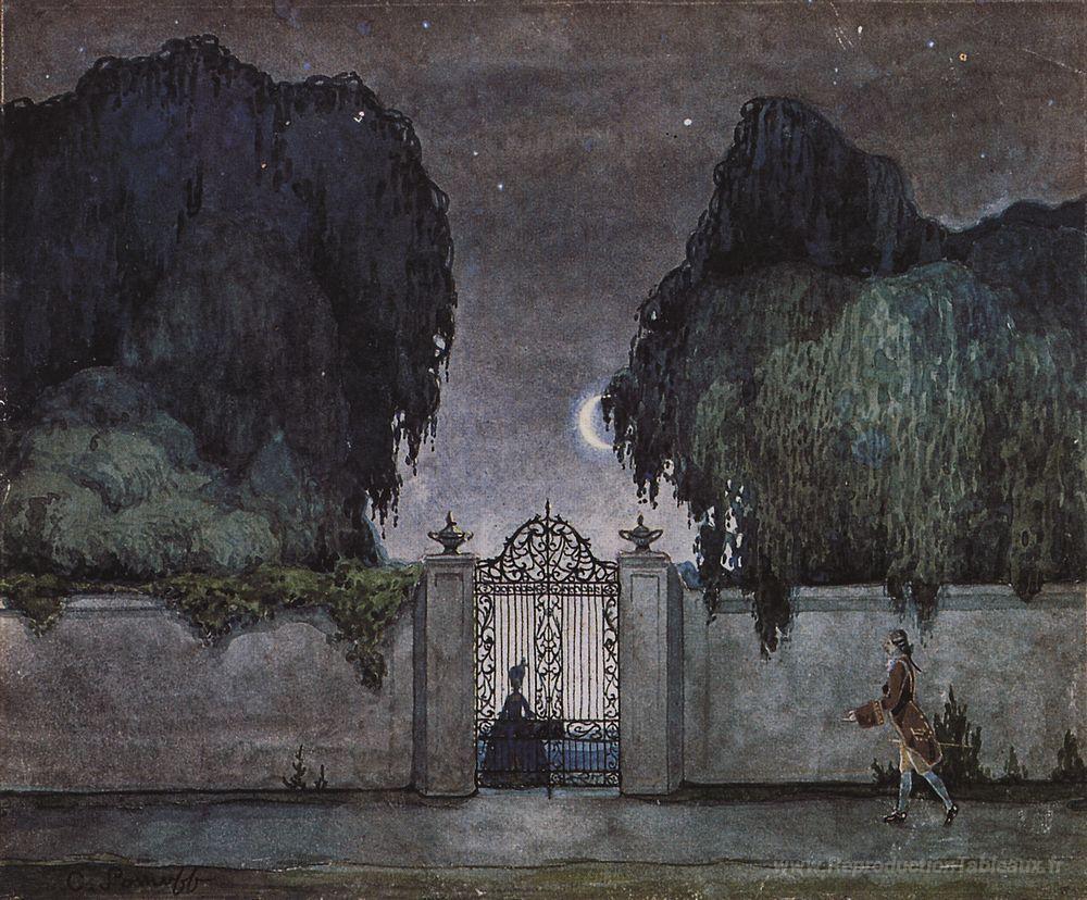Nous vous proposons une reproduction artisanale sur toile du célèbre tableau 'Un rendez-vous romantique' de Konstantin Somov, provenant du Musée de la Reproduction.