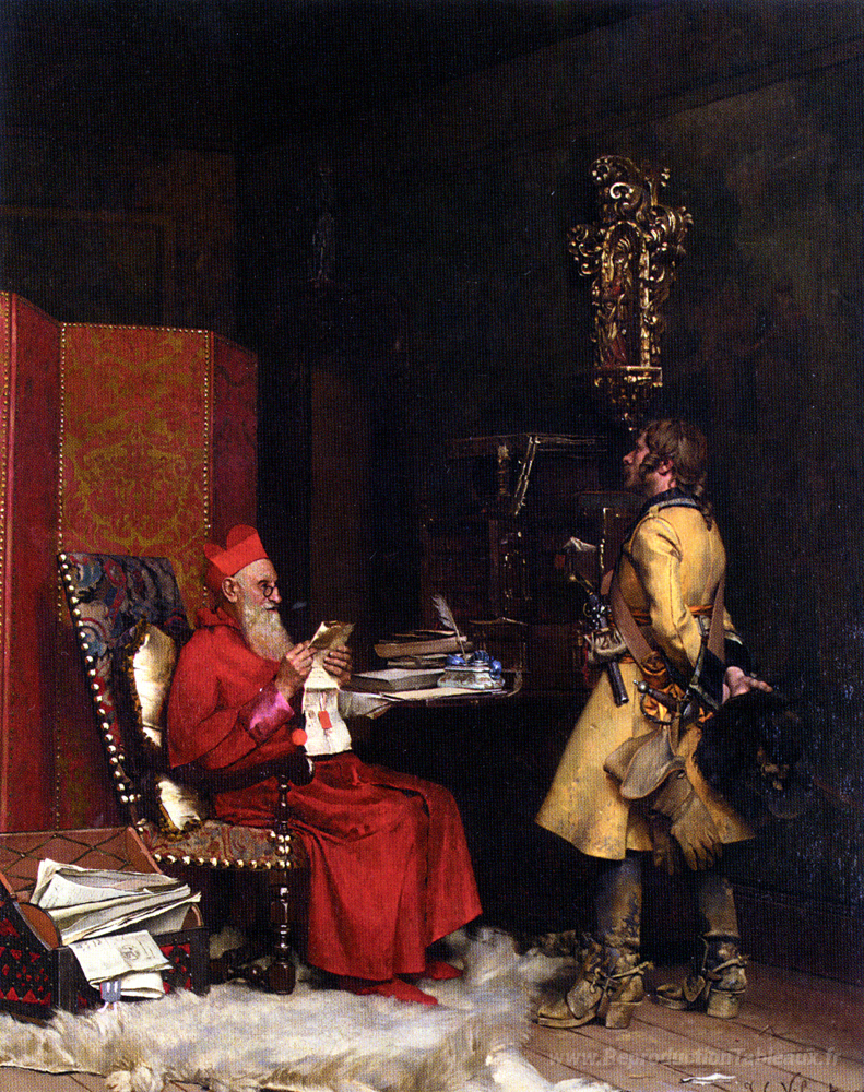 Nous vous proposons une reproduction artisanale sur toile du célèbre tableau 'Un secret d'État' de Jehan Georges Vibert, provenant du Musée de la Reproduction.