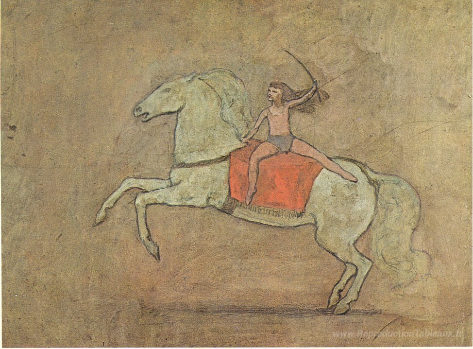 Nous vous proposons une reproduction artisanale sur toile du célèbre tableau 'Une cavalière' de Pablo Picasso, provenant du Musée de la Reproduction.