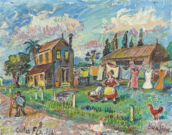 Nous vous proposons une reproduction artisanale sur toile du célèbre tableau 'Une grande journée de lavage' de David Burliuk, provenant du Musée de la Reproduction.