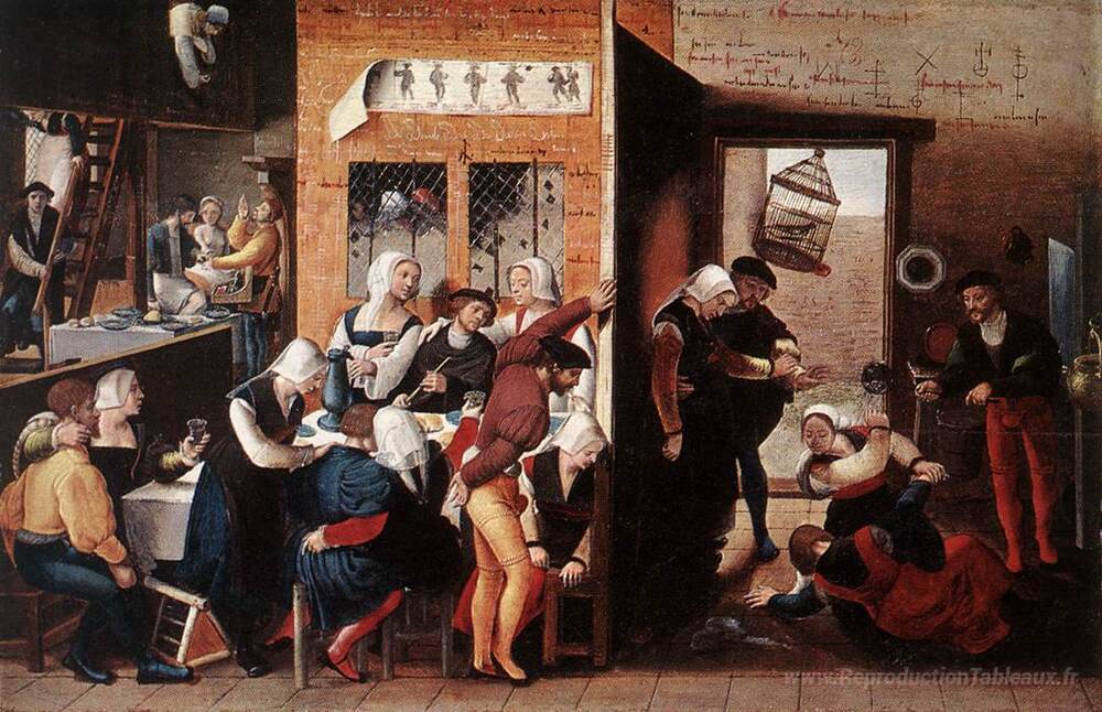 Nous vous proposons une reproduction artisanale sur toile du célèbre tableau 'Une joyeuse compagnie' de Jan van Hemessen, provenant du Musée de la Reproduction.