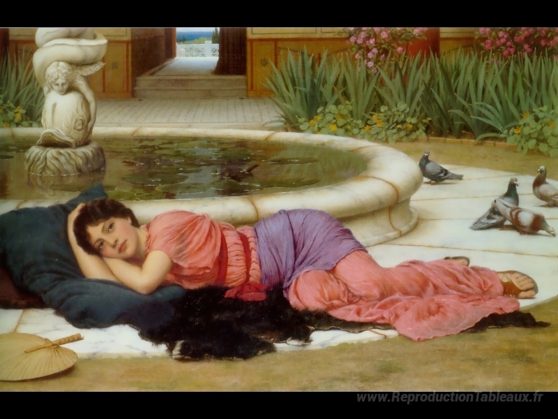 Nous vous proposons une reproduction artisanale sur toile du célèbre tableau 'Une retraite cool' de John William Godward, provenant du Musée de la Reproduction.