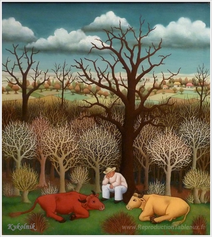 Nous vous proposons une reproduction artisanale sur toile du célèbre tableau 'Veiller sur deux vaches' de Ivan Generalic, provenant du Musée de la Reproduction.