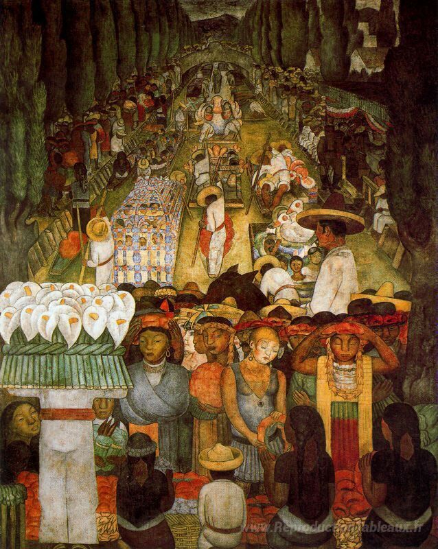 Nous vous proposons une reproduction artisanale sur toile du célèbre tableau 'Vendredi saint sur le canal de Santa Anita' de Diego Rivera, provenant du Musée de la Reproduction.