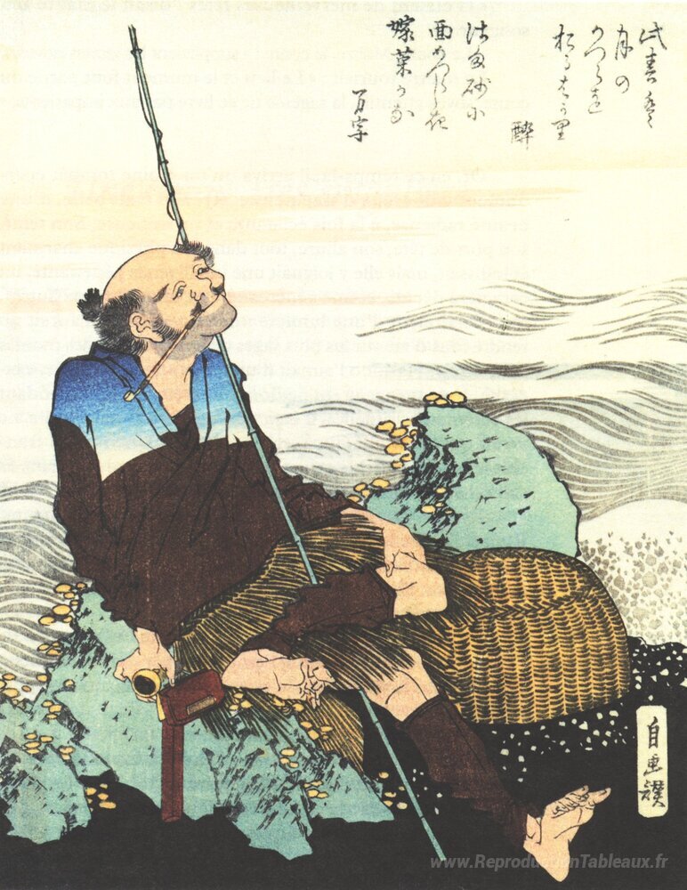 Nous vous proposons une reproduction artisanale sur toile du célèbre tableau 'Vieux pêcheur fumer sa pipe' de Katsushika Hokusai, provenant du Musée de la Reproduction.