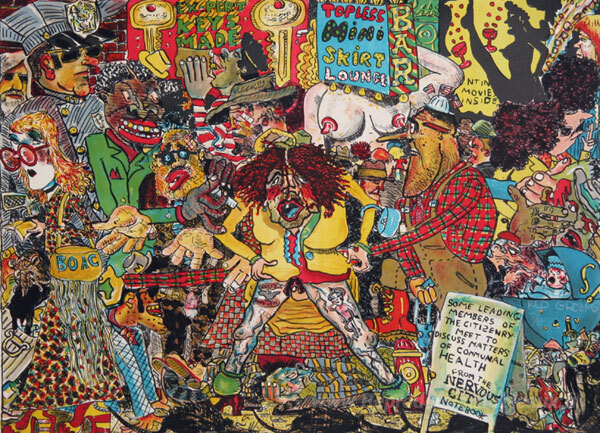 Nous vous proposons une reproduction artisanale sur toile du célèbre tableau 'Ville nerveuse' de Red Grooms, provenant du Musée de la Reproduction.